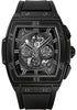 Hublot Spirit Of Big Bang Black Magic 42mm 42 mm microblasted black ceramic case, microblasted black ceramic bezel with 6 H-shaped black-plated titanium screws, sapphire crystal with anti-reflective treatment, sapphire crystal dial, HUB4700 self-winding skeleton movement with chronograph function, approximately 50 hours of power reserve, black rubber strap, deployant buckle. Water resistant to 100 meters.