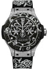 Hublot Big Bang Broderie Steel Diamonds Limited Edition of 200 Watch 41 mm polished stainless steel case set with 198 diamonds (~1.12 cts), carbon fiber bezel with silver embroidery and 6 H-shaped black PVD titanium screws, sapphire crystal with anti-reflective treatment and Hublot logo printed on the inner side, carbon fiber dial with silver embroidery and rhodium-plated appliques set with 11 diamonds (~0.20 cts), HUB1110 self-winding movement, approximately 42 hours of power reserve, black rubber and silk strap with silver embroidery, stainless steel deployant buckle. Water resistant to 100 meters.