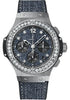 Hublot Big Bang Jeans Steel Diamonds Limited Edition of 250 Watch 41 mm satin-finished stainless steel case, polished and satin-finished stainless steel bezel set with 36 diamonds for 1.80k, sapphire crystal with anti-reflective treatment, genuine blue jeans dial with black subdials and 8 diamonds for 0.14k, HUB 4300 self-winding chronograph movement, approximately 42 hours of power reserve, black and blue rubber genuine blue jeans strap with grey or black stitching, stainless steel deployant buckle. Water resistant to 100 m.