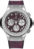 Hublot Big Bang Jeans Purple Diamonds Watch 41 mm polished and satin-finished stainless steel case, polished stainless steel bezel set with 114 diamonds (~1.18 cts) and 6 H-shaped titanium screws, sapphire crystal with anti-reflective treatment and Hublot logo printed on the inner side, purple genuine washed jeans dial with opaline subdials, rhodium-plated appliques set with 8 diamonds (~0.14 cts), rhodium plated hands, HUB4300 self-winding chronograph movement, approximately 42 hours of power reserve, black rubber and purple genuine jeans strap with assorted color stitching, stainless steel deployant buckle. Water resistant to 100 meters.