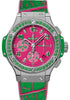 Hublot Big Bang Pop Art Steel Apple Limited Edition of 200 Watch 41 mm polished and satin-finished stainless steel case, polished stainless steel bezel set with 36 tsavorites and 6 H-shaped titanium screws, sapphire crystal with anti-reflective treatment, mat dark rose dial with rhodium plated appliques printed in apple and polished rhodium-plated hands, HUB4300 self-winding chronograph movement, approximately 42 hours of power reserve, rose rubber and mixed colored alligator strap, stainless steel deployant buckle. Water resistant to 100 meters.