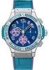 Hublot Big Bang Pop Art Limited Edition of 200 Watch 41mm stainless steel case sapphire crystal back,, white gold bezel with 6 H-shaped titanium screws and set with 48 baguette blue topazes, blue composite resin lateral inserts and bezel lugs, sapphire crystal with interior and exterior anti-reflective treatment, matt blue lacquered dial with rhodium plated applique indexes, self winding HUB 4300 movement with chronograph function, approximately 42 hours of power reserve, blue alligator and two tone rubber strap, stainless steel deployant buckle. Water resistant to 100 meters.
