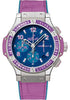 Hublot Big Bang Pop Art Limited Edition of 200 Watch 41mm stainless steel case sapphire crystal back,, white gold bezel with 6 H-shaped titanium screws and set with 48 baguette purple amethysts, purple composite resin lateral inserts and bezel lugs, sapphire crystal with interior and exterior anti-reflective treatment, matt blue lacquered dial with rhodium plated applique indexes, self winding HUB 4300 movement with chronograph function, approximately 42 hours of power reserve, purple alligator and two tone rubber strap, stainless steel deployant buckle. Water resistant to 100 meters.
