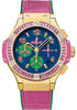 Hublot Big Bang Pop Art Limited Edition of 200 Watch 41mm 18K 3N gold case sapphire crystal back,, 18K 3N gold bezel with 6 H-shaped titanium screws and set with 48 baguette pink sapphires, pink composite resin lateral inserts and bezel lugs, sapphire crystal with interior and exterior anti-reflective treatment, matt blue lacquered dial with gold plated applique indexes, self winding HUB 4300 movement with chronograph function, approximately 42 hours of power reserve, pink alligator and two tone rubber strap, gold PVD coated 18K 3N gold buckle. Water resistant to 100 meters.