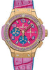 Hublot Big Bang Pop Art Yellow Gold Purple Limited Edition of 200 Watch 41 mm polished and satin-finished 18K 3N yellow gold case, polished 18K 3N gold bezel set with 36 amethysts with 6 H-shaped titanium screws, sapphire crystal with anti-reflective treatment, mat dark rose dial with gold plated appliques printed in purple and polished gold-plated hands, HUB4300 self-winding chronograph movement, approximately 42 hours of power reserve, blue rubber and mixed colored alligator strap, 18K 3N gold and 3N gold plated stainless steel deployant buckle. Water resistant to 100 meters.