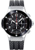 41mm stainless steel case, black ceramic bezel, black carbon dial, self winding HUB 41 movement with chronograph function, approximately 42 hours of power reserve, black rubber strap with deployant buckle. Water resistant to 100 meters.