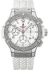 41mm stainless steel case, stainless steel bezel, white composite resin lateral inserts and bezel lugs, white dial, self winding HUB 4300 movement with chronograph function, approximately 42 hours of power reserve, white rubber strap with deployant buckle. Water resistant to 100 meters.