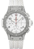 41mm stainless steel case, set with 198 diamonds (0.96 ct) back, stainless steel bezel set with 114 diamonds (1.22 ct), white composite resin lateral inserts and bezel lugs, white dial, self winding HUB 4300 movement with chronograph function, approximately 42 hours of power reserve, white rubber strap with deployant buckle. Water resistant to 100 meters.