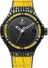 41mm polished black ceramic case, black PVD 18K white gold bezel set with 48 baguette citrinnes, black composite resin lateral inserts and bezel lugs, polished black ceramic dial with polished rhodium plated hands, self winding HUB 1112 movement, approximately 42 hours of power reserve, black rubber and yellow alligator strap with black PVD stainless steel deployant buckle. Water resistant to 100 meters.