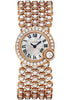 24.2mm 18K pink gold case set with brilliant-cut diamonds, 8.44mm thick, 18K pink gold bezel set with brilliant-cut diamonds, sapphire crystal, mother of pearl dial with solitaire diamond nestled into the curve of the dial, quartz movement, mother of pearl bracelet with paved bubble. Water resistant to 30 meters.