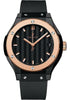 Hublot Classic Fusion Ceramic King Gold Watch 33 mm satin finished and polished black ceramic case, satin-finished and polished 18K king gold bezel, sapphire crystal with anti-reflective treatment, black dial with mat carbon fiber, HUB2912 quartz movement, approximately 3 to 5 years of power reserve, black lined rubber strap, 18K red gold deployant buckle. Water resistant to 50 meters.