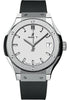 Hublot Classic Fusion Titanium Opalin Watch 33 mm (available in 42 and 38 mm) satin finished and polished titanium case, satin finished and polished titanium bezel, sapphire crystal, silver opalin dial, HUB2912 quartz movement, approximately 3 to 5 years of power reserve, black lined rubber strap, stainless steel deployant buckle. Water resistant to 50 meters.