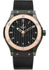 Hublot Classic Fusion Ceramic Gold Watch 38mm black ceramic case, 18K red gold bezel, carbon dial, quartz HUB 2910 movement, black rubber strap with deployant buckle. Water resistant to 100 meters.