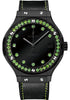 38 mm polished black ceramic case, polished black-plated bezel set with 36 Tsavorites, sapphire crystal with anti-reflective treatment, black dial with black-plated appliques and hands and set with 11 Tsavorites, HUB1110 self-winding movement, approximately 42 hours of power reserve, black rubber and black shiny calf with blue stitching strap, black PVD stainless steel deployant buckle. Water resistant to 50 meters.