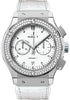 42 mm polished and satin finished titanium case, polished titanium bezel set with 138 diamonds for 1.01cts, sapphire crystal with anti-reflective treatment, white dial with polished rhodium-plated appliques and hands, HUB1153 self-winding movement with chronograph, approximately 42 hours of power reserve, white rubber and alligator strap, stainless steel deployant buckle. Water resistant to 50 meters.