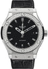 42mm titanium case, titanium bezel set with 138 diamonds (1.12ct), black composite resin lateral inserts and bezel lugs, mat black dial, self winding HUB 1110 movement, approximately 42 hours of power reserve, black rubber and alligator strap with deployant buckle. Water resistant to 50 meters.