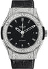 42mm titanium case set with 228 diamonds (1.55ct), titanium bezel set with 138 diamonds (1.12ct), black composite resin lateral inserts and bezel lugs, mat black dial, self winding HUB 1110 movement, approximately 42 hours of power reserve, black rubber and alligator strap with deployant buckle. Water resistant to 50 meters.