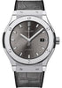 42 mm titanium case, brushed titanium bezel with 6 H-shaped titanium screws, sapphire crystal with anti-reflective treatment, grey sunray satin-finished dial, HUB 1110 self-winding movement, approximately 42 hours of power reserve, black alligator strap, push button folding buckle. Water resistant to 50 meters.