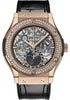 Hublot Classic Fusion Aerofusion Moonphase King Gold Diamonds Watch 45 mm (available in 42 mm) satin-finished and polished 18K king gold case, polished 18K King Gold bezel set with 126 diamonds for 1.41cts and 6 H-shaped titanium screws, sapphire crystal with anti-reflective treatment, sapphire dial, HUB 1131 self-winding movement with moonphase, approximately 42 hours of power reserve, black rubber and alligator strap, 18K red gold and black-plated stainless steel deployant buckle. Water resistant to 50 meters.