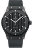 Hublot Classic Fusion Black Magic Watch 45 mm polished and satin-finished black ceramic case, vertical satin-finished black ceramic bezel with 6 H-shaped titanium screws, sapphire crystal with anti-reflective treatment, mat carbon fiber dial with polished rhodium-plated appliques and hands, HUB1112 self-winding movement, approximately 42 hours of power reserve, black lined rubber strap, black PVD stainless steel deployant buckle. Water resistant to 50 meters.