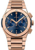 Hublot Classic Fusion Blue Chronograph King Gold Bracelet Watch 45 mm satin-finished and polished 18K King Gold case, satin-finished and polished 18K King Gold bezel with 6 H-shaped titanium screws, sapphire crystal with anti-reflective treatment, blue sunray dial, HUB 1143 self-winding movement with chronograph, approximately 42 hours of power reserve, satin-finished and polished 18K King Gold bracelet, 18K King Gold deployant buckle. Water resistant to 50 meters.