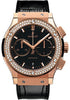 Hublot Classic Fusion Chronograph King Gold Watch 45 mm (available in 42 mm) polished and satin-finished 18K King Gold case, vertical satin-finished 18K King Gold bezel with 6 H-shaped titanium screws, sapphire crystal with anti-reflective treatment, black dial with satin-finished and gold plated appliques and polished gold-plated hands, HUB1143 self-winding movement with chronograph, approximately 42 hours of power reserve, black rubber and alligator strap, 18K red gold and black PVD stainless steel deployant buckle. Water resistant to 50 meters.