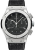 45mm titanium case, sapphire crystal back, titanium bezel, black composite resin lateral inserts and bezel lugs, mat black dial, self winding HUB 1143 movement with chronograph function, approximately 42 hours of power reserve,. Water resistant to 50 meters.