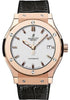 Hublot Classic Fusion Automatic Gold Watch 45 mm 18K rose gold case with brushed finished top and bottom center links between the lugs, black composite resin bezel end pieces, 18K rose gold crown engraved with the Hublot logo, 18K rose gold bezel with a brushed finished top & polished finished beveled edge, secured with 6 polished "H" style titanium screws, sapphire crystal with anti-reflective treatment, silver opalin dial with polished gold-plated applique hour markers and hands with rose gold skeletonized brushed finished, HUB1112 self-winding movement, approximately 42 hours of power reserve, black alligator strap, stainless steel deployant buckle. Water resistant to 50 meters.