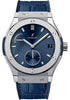 Hublot Classic Fusion Power Reserve Titanium Blue Watch 45 mm satin-finished and polished titanium case, satin-finished and polished titanium bezel with 6 H-shaped titanium screws, sapphire crystal with anti-reflective treatment, blue sunray dial, HUB 1602 manual movement with manual-winding power reserve, approximately 192 hours of power reserve, blue rubber and alligator strap, stainless steel deployant buckle. Water resistant to 50 meters.