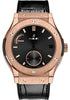 45 mm polished and satin-finished 18K King Gold case, vertical satin-finished 18K King Gold bezel with 6 H-shaped titanium screws, sapphire crystal with anti-reflective treatment, black dial with polished Gold-plated appliques and hands, HUB1601 manual movement with reserve movement, approximately 192 hours / 8 days of power reserve, black rubber and alligator strap, 18K red gold and black PVD stainless steel deployant buckle. Water resistant to 50 meters.
