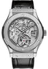 Hublot Classic Fusion Tourbillon Cathedral Minute Repeater Titanium Limited Edition of 50 Watch 45 mm polished and satin finished titanium case, polished and satin-finished titanium bezel set with 6 H-shaped titanium screws, sapphire crystal with anti-reflective treatment, sapphire dial with polished rhodium-plated appliques and hands, HUB8001 manual movement, approximately 85 hours of power reserve, black rubber and alligator strap, stainless steel deployant buckle. Water resistant to 30 meters.