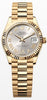 This Oyster Perpetual Datejust 31 in 18 kt yellow gold features a silver, diamond-set dial and a President bracelet.