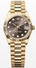 This Oyster Perpetual Datejust 31 in 18 kt yellow gold features a dark grey, diamond-set dial and a President bracelet.