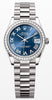 This Oyster Perpetual Datejust 31 in 18 kt white gold features a bright blue dial and a President bracelet.
