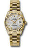31mm 18K yellow gold case, fluted bezel, case lugs set with 24 diamonds, mother of pearl dial, diamond hour markers, and President bracelet.