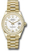 31mm 18K yellow gold case, screw-down crown with twinlock double waterproofness system, bezel set with 46 diamonds, scratch-resistant sapphire crystal with cyclops lens over the date, white dial, Roman numerals, Rolex calibre 2236 automatic movement with center hour, minute and seconds hands, instantaneous date with rapid setting, and stop-seconds for precise time setting, approximately 55 hours of power reserve, 18K yellow gold President bracelet with semi-circular three-piece links, concealed folding Crownclasp buckle. Waterproof to 100 meters.