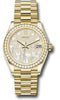 31mm 18K yellow gold case, screw-down crown with twinlock double waterproofness system, bezel set with 46 diamonds, scratch-resistant sapphire crystal with cyclops lens over the date, diamond paved mother-of-pearl butterfly dial, Rolex calibre 2236 automatic movement with center hour, minute and seconds hands, instantaneous date with rapid setting, and stop-seconds for precise time setting, approximately 55 hours of power reserve, 18K yellow gold President bracelet with semi-circular three-piece links, concealed folding Crownclasp buckle. Waterproof to 100 meters.