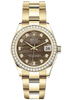 31mm 18K yellow gold case, screw-down crown with twinlock double waterproofness system, bezel set with 46 diamonds, scratch-resistant sapphire crystal with cyclops lens over the date, dark mother-of-pearl dial, 10 diamond hour markers, Rolex calibre 2236 automatic movement with center hour, minute and seconds hands, instantaneous date with rapid setting, and stop-seconds for precise time setting, approximately 55 hours of power reserve, 18K yellow gold Oyster bracelet with flat three-piece links, concealed folding Crownclasp buckle. Waterproof to 100 meters.