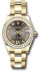 31mm 18K yellow gold case, screw-down crown with twinlock double waterproofness system, bezel set with 46 diamonds, scratch-resistant sapphire crystal with cyclops lens over the date, dark grey diamond Roman IV dial, Roman numerals with 11 diamonds set on VI, Rolex calibre 2236 automatic movement with center hour, minute and seconds hands, instantaneous date with rapid setting, and stop-seconds for precise time setting, approximately 55 hours of power reserve, 18K yellow gold Oyster bracelet with flat three-piece links, concealed folding Crownclasp buckle. Waterproof to 100 meters.