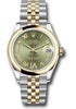 31mm yellow Rolesor case comprised of Oystersteel and 18K yellow gold, screw-down back, screw-down crown with twinlock double waterproofness system, 18K yellow gold domed bezel, scratch-resistant sapphire crystal with cyclops lens over the date, olive green dial, Roman numerals with 11 diamonds set on VI, Rolex calibre 2236 perpetual self-winding movement with date at 3 o'clock, approximately 55 hours of power reserve, yellow Rolesor Jubilee bracelet with semi-circular three-piece links, concealed folding Crownclasp buckle. Waterproof to 100 meters. Baselworld 2019 release.