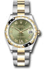 31mm yellow Rolesor case comprised of Oystersteel and 18K yellow gold, screw-down back, screw-down crown with twinlock double waterproofness system, 18K yellow gold domed bezel set with diamonds, scratch-resistant sapphire crystal with cyclops lens over the date, olive green dial, Roman numerals with 11 diamonds set on VI, Rolex calibre 2236 perpetual self-winding movement with date at 3 o'clock, approximately 55 hours of power reserve, yellow Rolesor Oyster bracelet made from a combination of 904L steel and 18K yellow gold with flat three-piece links, folding Oysterclasp buckle with Easylink 5mm comfort extension link. Waterproof to 100 meters. Baselworld 2019 release.