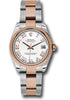 31mm stainless steel case, Everose gold screw-down crown, 18K Everose gold domed bezel, scratch-resistant sapphire crystal with cyclops lens over the date, white dial, Roman numerals, Rolex calibre 2235 automatic movement, stainless steel and Everose gold Oyster bracelet with flat three-piece links, folding Oysterclasp buckle with Easylink 5mm comfort extension link. Waterproof to 100 meters.