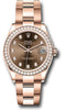 31mm 18K Everose gold case, screw-down crown with twinlock double waterproofness system, bezel set with 46 diamonds, scratch-resistant sapphire crystal with cyclops lens over the date, chocolate dial, diamond hour markers, Rolex calibre 2236 automatic movement with center hour, minute and seconds hands, instantaneous date with rapid setting, and stop-seconds for precise time setting, approximately 55 hours of power reserve, 18K Everose gold Oyster bracelet with flat three-piece links, concealed folding Crownclasp buckle. Waterproof to 100 meters. Baselworld 2019 release.