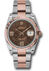 36mm stainless steel case, 18K Everose gold screw-down crown, 18K Everose gold fluted bezel, scratch-resistant sapphire crystal with cyclops lens over the date, chocolate floral dial, diamond Arabic 6 and...