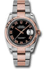 36mm stainless steel case, 18K Everose gold screw-down crown, 18K Everose gold fluted bezel, scratch-resistant sapphire crystal with cyclops lens over the date, black dial, Roman numerals, Rolex calibre 3135 automatic movement, stainless steel and 18K Everose gold Oyster bracelet with three-piece links, folding Oysterclasp buckle with Easylink 5mm comfort extension link. Waterproof to 100 meters.