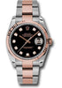 36mm stainless steel case, 18K Everose gold screw-down crown, 18K Everose gold fluted bezel, scratch-resistant sapphire crystal with cyclops lens over the date, black dial, diamond hour markers, Rolex calibre 3135 automatic movement, stainless steel and 18K Everose gold Oyster bracelet with three-piece links, folding Oysterclasp buckle with Easylink 5mm comfort extension link. Waterproof to 100 meters.