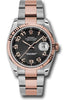 36mm stainless steel case, 18K Everose gold screw-down crown, 18K Everose gold fluted bezel, scratch-resistant sapphire crystal with cyclops lens over the date, black concentric circle dial, Arabic numerals, Rolex...