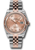 36mm stainless steel case, 18K Everose gold screw-down crown, 18K Everose gold fluted bezel, scratch-resistant sapphire crystal with cyclops lens over the date, champagne dial, Roman numerals, Rolex calibre 3135 automatic movement, stainless steel and 18K Everose gold Jubilee bracelet with five-piece links, concealed folding Crownclasp buckle. Waterproof to 100 meters.