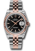 36mm stainless steel case, 18K Everose gold screw-down crown, 18K Everose gold fluted bezel, scratch-resistant sapphire crystal with cyclops lens over the date, black dial, index hour markers, Rolex calibre 3135 automatic movement, stainless steel and 18K Everose gold Jubilee bracelet with five-piece links, concealed folding Crownclasp buckle. Waterproof to 100 meters.