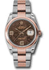36mm stainless steel case, 18K pink gold domed bezel, chocolate floral dial, diamond Arabic 6 and 9 numerals, and stainless steel and 18K pink gold Oyster bracelet.